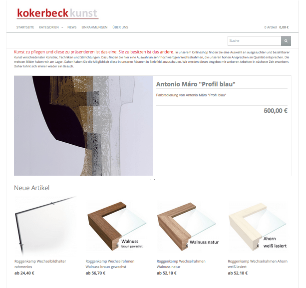Kokerbeck ist auch bekannt durch ausgefallene und bezahlbare Kunst. In unserem Bestand finden sich Arbeiten verschiedenster Künstler. Diese können Sie sich in unserem neuen Onlineshop kokerbeck-kunst.de anschauen und direkt bestellen. Falls Ihnen dort Arbeiten gefallen können Sie diese in der Regel in unseren Räumen in Bielefeld Brackwede direkt anschauen. Stöbern Sie auf unserer neuen Onlinepräsenz unter kokerbeck-kunst.de